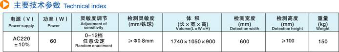 技术性能及参数:1.优质元件的选用,使之具有很高的灵敏度和很强的抗干扰能力。2.当检测到断针或其它铁类物时,声光将同时报警,红色灯光会指示出金属物所处的位置,此时被检物会自动停下并返回。3.实现A、B、c、D、四种机型功能的兼容,可自由选择使用。4.智能计数器对被检物(合格品、非合格品)的数量实现准确记录。5.检测灵敏度可在操作面板上实现自由调节(o—12档),直至达到您的要求。6.设有自动启动程序及自动保护装置,并安装有程序锁定装置。7.可根据用户产品的需要及特点定制设备的检测高度及宽度。